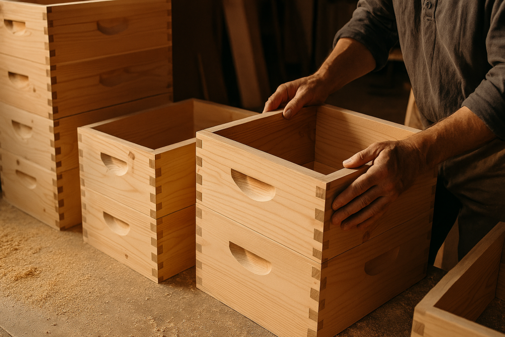 Nástavky u nás musí hlavně dobře sloužit včelám – držet teplo, vydržet zimu a zároveň být lehké na každodenní práci. Proto saháme po pevném, dobře vysušeném dřevu a hlídáme si přesnost každé drážky i spoje, aby na sebe jednotlivé díly přesně dosedaly a nikde zbytečně nefoukalo.